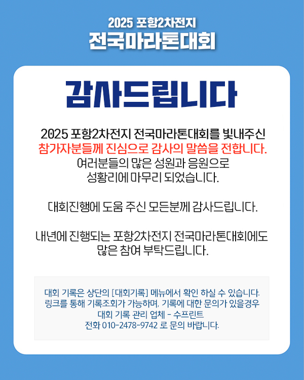 공지사항 NOTICE 10.102025.[포항2차전지전국마라톤대회 대회사진공유] 10.012025.[입상자 명단 1위~10위] 09.292025.[마라톤대회 드론사진] 09.292025.[기록관련문의] 09.262025.📢 주차장 추가 확보 안내